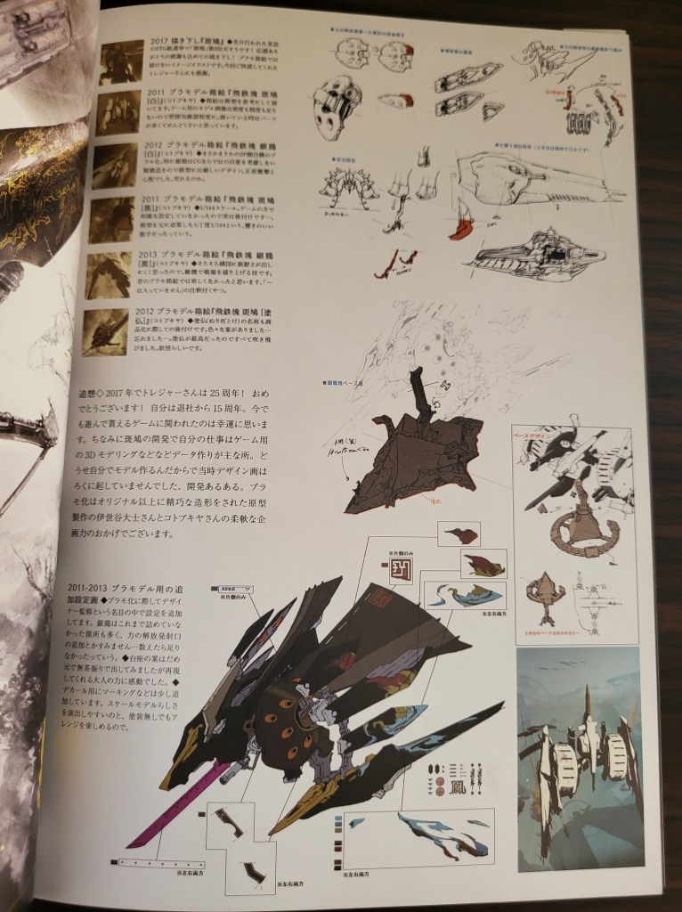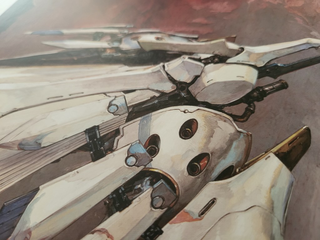 Much has already been said about the classic shoot ’em up. While the game is undisputably a work of art, the artwork Suzuki-San created for the game is legendary. The prints featured in this book are mostly for the plastic model kit boxes. The amount of detail and thought put into the functionality of each ship shows his dedication to the craft. He takes weight and velocity, among other factors, into consideration. The designs do not resemble the typical structure of a spacecraft that we are accustomed to. Suzuki-San has made something that resembles a bird, a tank, and a jet. I highly recommend finding high resolution images of these pieces online and taking the time to soak them in.